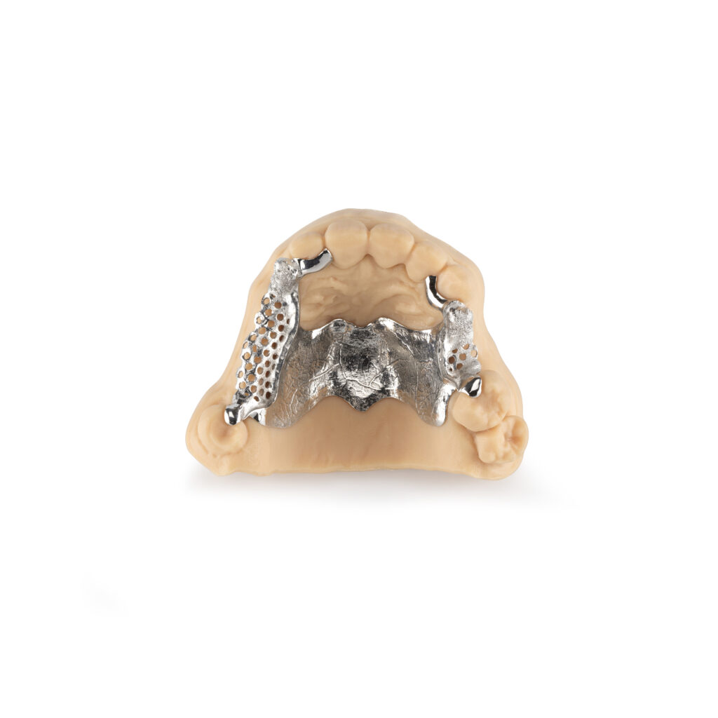 Metal-plate dentures, dental and prosthodontic procedures that replace missing teeth. These prostheses are durable and reliable because they combine functionality and aesthetics by reinforcing the metal base with a tooth-coloured ceramic composite coating or acrylic denture.